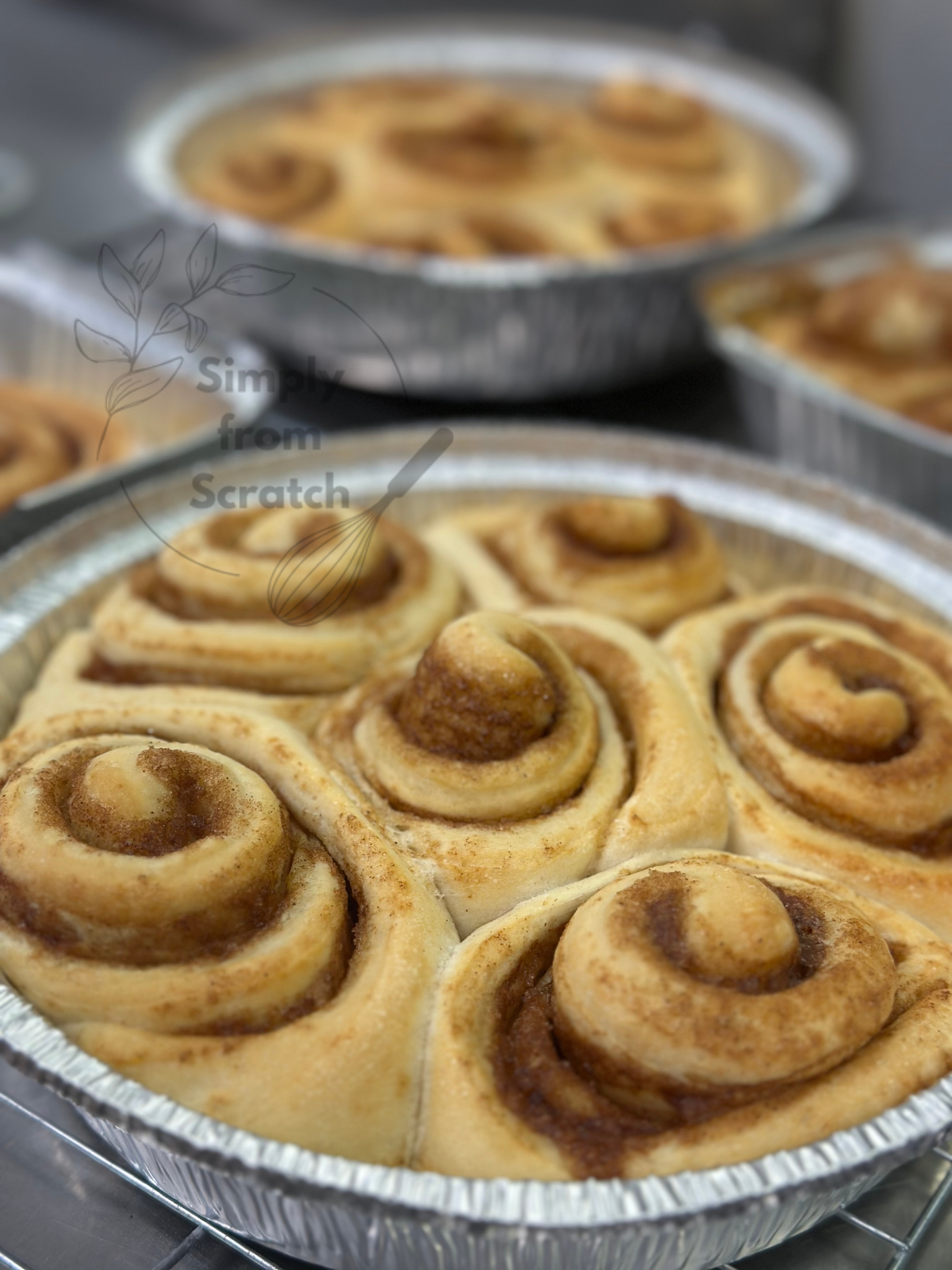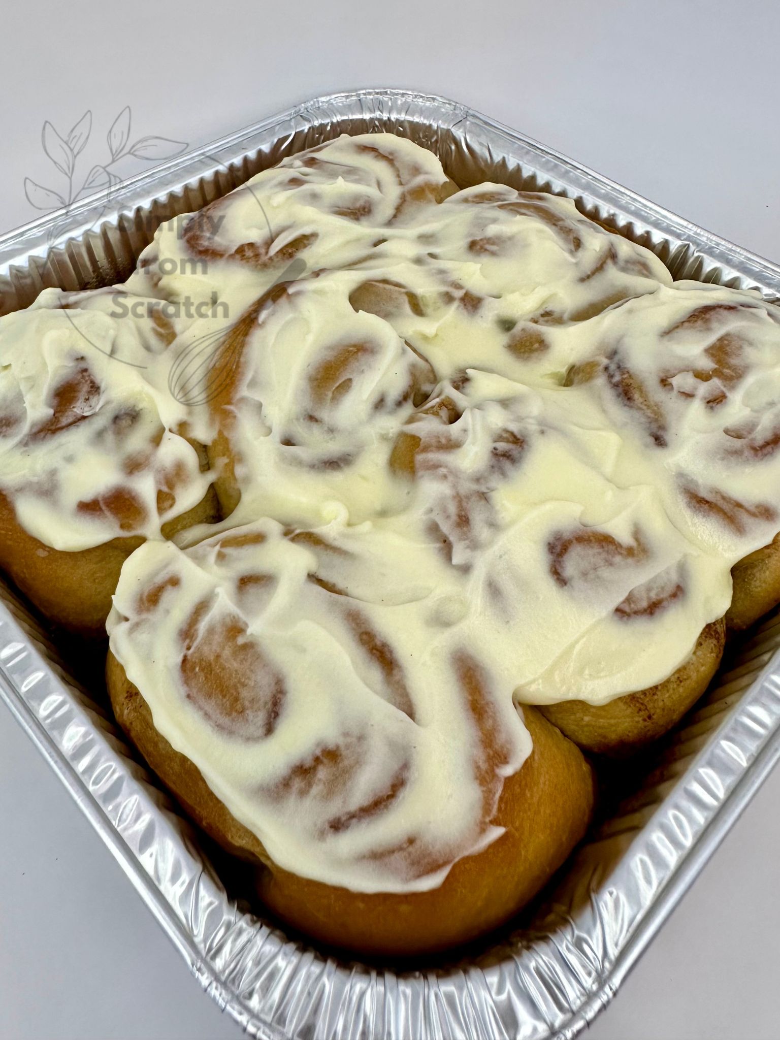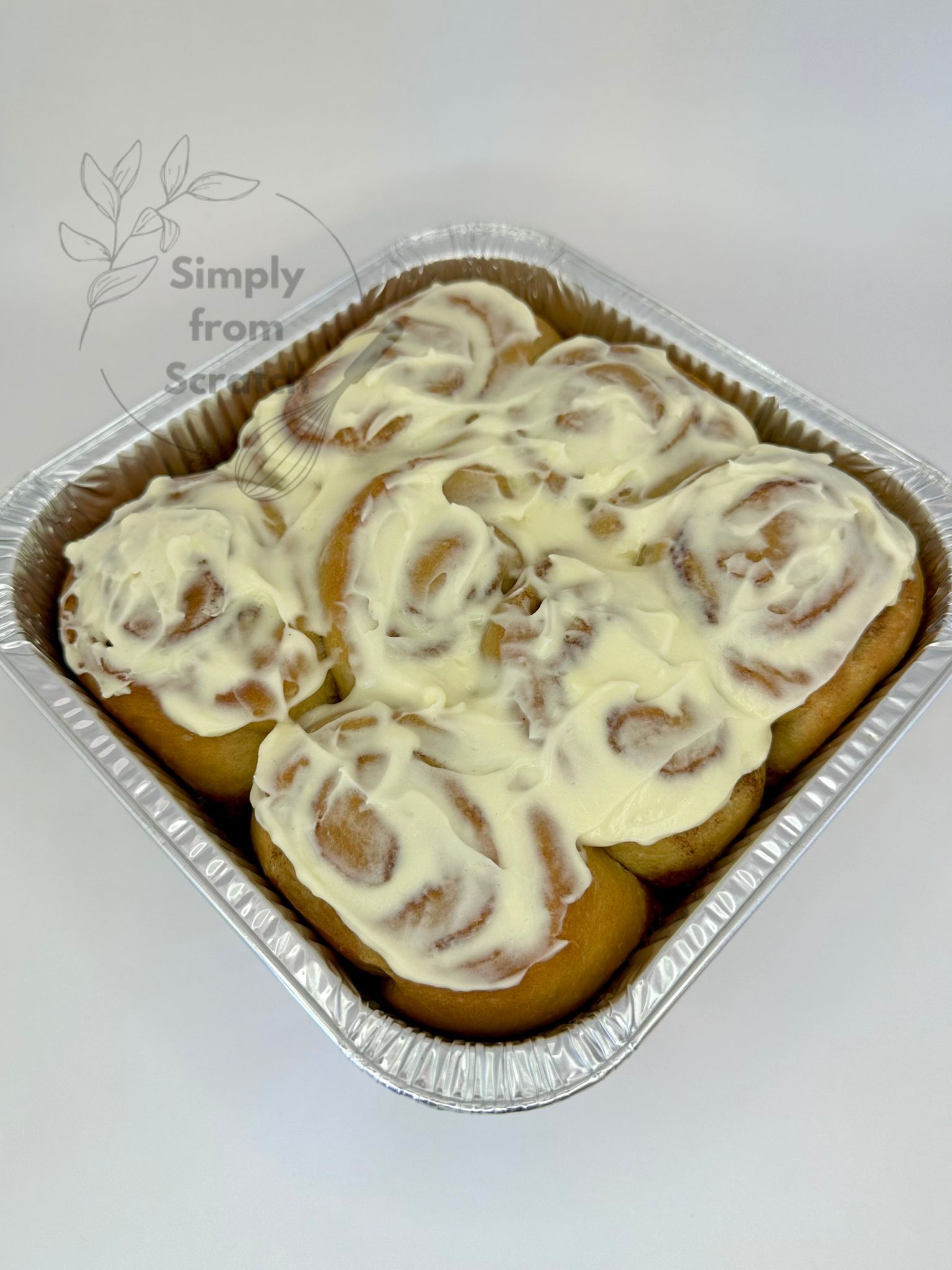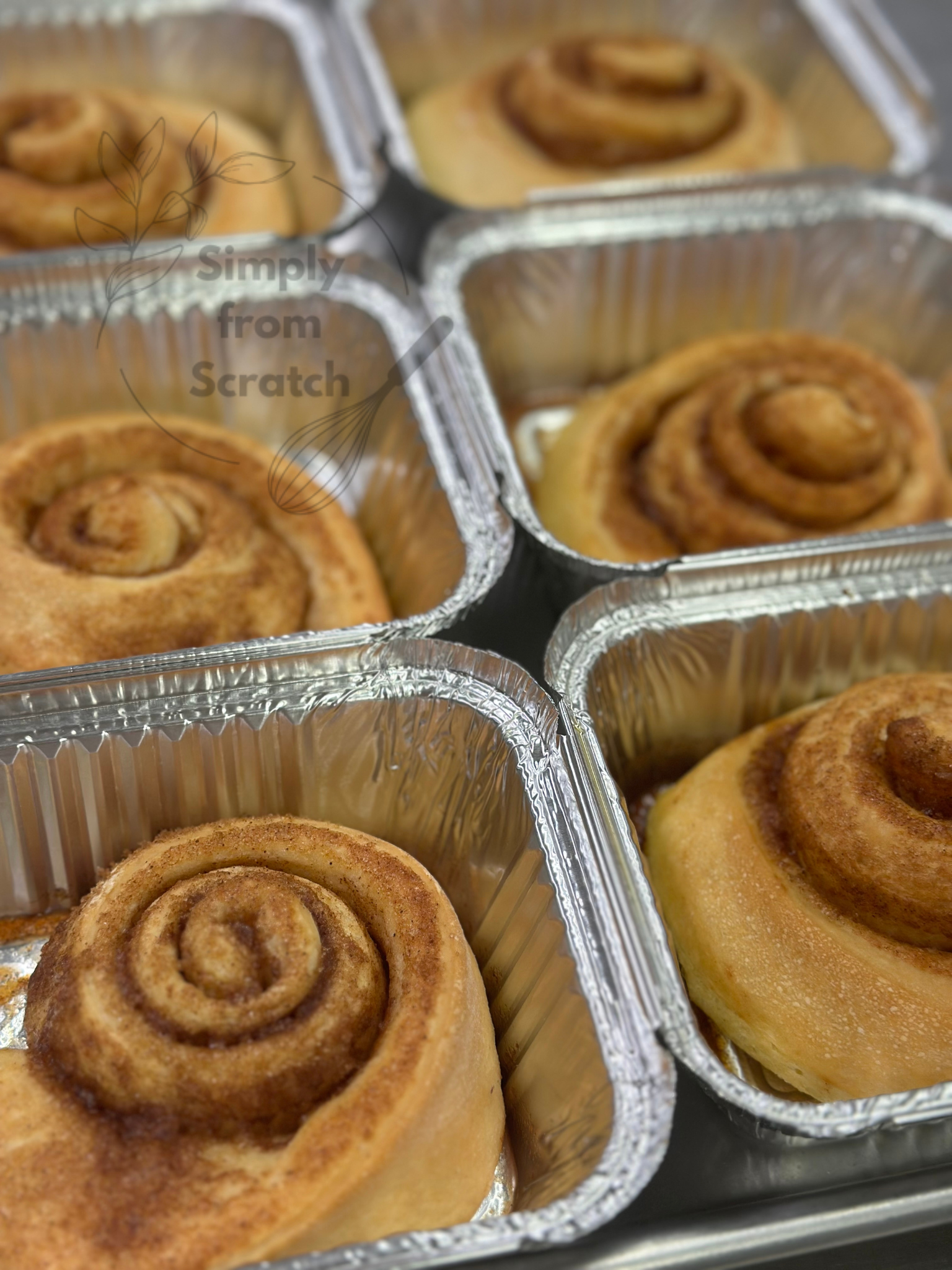 Pans hold 6 cinnamon rolls, iced upon purchase.