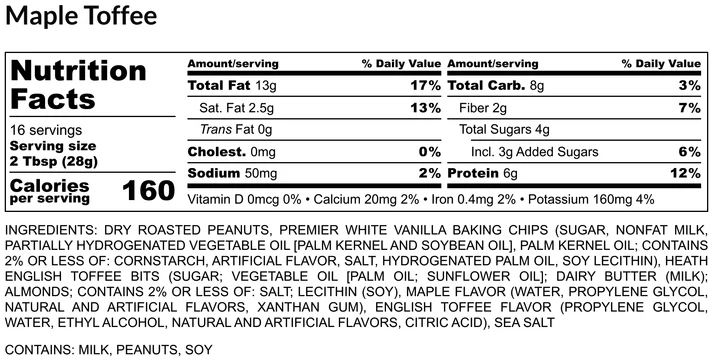 Our handcrafted small-batch Maple Toffee Peanut Butter is 100% gluten-free, naturally high in protein and low in sugar.